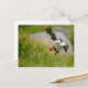 Postkarte eines fliegenden Puffvogels, der auf der Insel Runde an der Atlantikküste Norwegens landet.