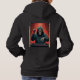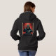 Timbre-poste rétro d'un squelette capodé DJ avec un visage crâne, les mains soulevées dans l'air, arrière - plan de projecteur rouge, fraise de timbre, style vintage en détresse, tonalités rouges et noires audacieuses.