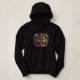 This women's pullover hoodie is shown in black with a fancy Mardi Gras mask art print.