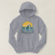 Sunrise Flow features a woman practicing paddleboard yoga as the golden sun is rising and the teal blue sea ripples as she poses confidently in reverse warrior on her board. The light distressing, font and color combination give this graphic a retro surf shack vibe. This hoodie is perfect for yogis, paddleboarders and those living the coastal life. | Pro-Tip: For vibrant colors, we recommend vivid printing for most apparel. For white apparel select classic printing.