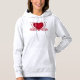 A large red heart is centered on a pink background, flanked by two smaller hearts and stylized eyes containing heart shapes. The design incorporates symmetry and a romantic theme with a bold color palette.