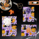 Niedliche schwarze Katzen unter Kürbis, halloween Süßigkeiten, Fledermäuse, Besen, Sterne, Süßmais, Eichen, Vollmond, Herbstblätter und ein niedlicher Geist das ganze Set in einem Umfeld von leicht lila