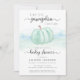 Eine niedliche, fröhliche und helle Babydusche mit der Aufschrift "A Sweet Little Pumpkin Is On Your Way", die in einer Mischung aus sanfter grauer, moderner Typografie und stilvollem Schriftsatz geschrieben ist, und einer minzgrünen und pastellblauen Wasserfarbe eines Kürbis. Darunter ist "Baby-Dusche" in der gleichen stilvollen Schrift geschrieben und Sie können den Namen der Mutter personalisieren und die Details in minimaler moderner Typografie duschen.