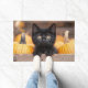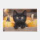 Adorable schwarze Kätzchen mit goldenen Augen flüchtige Blicke aus einer Kiste umgeben von Kürbissen.