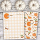 Handgezeichnete Illustrationen von Kürbiskuchen, Kürbissen, Zimt-Sticks und Herbst Herbstblatt Illustrationen auf kariertem Hintergrund Gingham. Ein wunderschönes Design, das sich perfekt für Herbst-Wohngestaltung, Erntedank-Dekoration und Geschenke eignet. Ein niedliches Kürbiskuchendesign mit orangen und braunen Farbtönen.