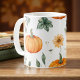 Eine orangefarbene Kürbismuster-Tasse mit einem Aquarellherbstdesign mit fallendem Blätter. Ideal für Kürbisspitzliebhaber oder als niedliche Saisondekoration.