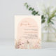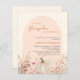 Eine elegante kleine Kürinin ist auf dem Weg Baby Shower Einladung. Cremefarbener Hintergrund und pfirsichfarbener Bogen. Die Einrichtung besteht aus Wildblumen in Beige, Rosa und einem cremefarbenen Kürbis. 1 Blatt = 1 Einladung mit Druckkante bis Kante.