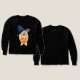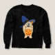 Whimsical cartoon dog in a wide wizard hat carries a glowing jack-o'-lantern. Bold lines, warm autumn colours, Halloween vibe, ideal for playful apparel and festive gifts.