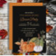 Erntedank Dinner Party Einladung mit Herbstlauben und Orange, Weiß und grüne Kürbis auf einem eleganten schwarzen Hintergrund.