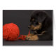 Rottweiler 1,5 Monate alter Welpe spielt mit roter Garnkugel