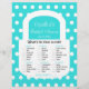Brauchen Sie ein Brautparty-Party, was in Ihrem Geldbeutel steckt? Nun, das ist ein Spaß. Die niedliche, weiße Tasche mit türkisblauem Hintergrund, auf der weiße Polka-Punkte erscheinen, ist in diesem Design gehalten. Das, was in Ihrem Geldbörsenspiel ist, hat verschiedene Punktewerte für verschiedene Gegenstände und dann einen Platz für die Gesamtpunkte. Sie können das Spiel sogar mit dem Namen der Braut und dem Datum personalisieren. Das ist ein lustiges Spiel, um jeden anfangen zu können, der am Brautparty lächelt. Copyright henishouseuse paper