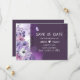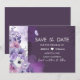 An elegant purple floral wedding save the date card featuring soft watercolor flowers in lavender, blush, and white, accented with delicate botanical line art and a graceful butterfly. The split layout with a deep plum panel creates a romantic and sophisticated look, making this card perfect for announcing your wedding date in style. A beautiful choice for garden weddings, spring weddings, summer celebrations, and coordinated floral wedding stationery suites.