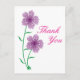 Einfache, hübsche, violette Blumen, die auf weißem Hintergrund verlassen sind. Rosa Text mit "Danke" rechts neben der Karte.