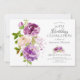 Invitation florale à la fête du 16e anniversaire avec de magnifiques pivoines violettes et crème peintes à la main et des feuilles verts verdoyants. Retournez notre invitation pour voir un papillon d'aquarelle violet coordonné pour une touche spéciale.