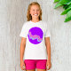 Planets hold a real fascination with a lot of us. This design is an interesting take on a planet. It is a purple planet that has a pink and blue squiggly stripe around the middle of it. It looks really effective. This purple planet design looks great on this girls t-shirt. Perfect for yourself or as a gift
