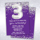 Purple and silver 3ème anniversaire invitation à la fête d'âge 3 anniversaire invitation à la fête d'anniversaire avec parties scintillant et écriture de script moderne et ballon amusant.