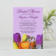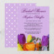 Le bouquet de tulipe jaune et violet crée une belle invitation à la douche nuptiale printanière. L'écriture formelle est utilisée pour les mots douche nuptiale et le nom de la mariée. L'arrière - plan est un mauve doux pour compléter le design floral. Le dos de l'invitation est de petits pois blancs sur le violet.