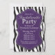 Ces adorables invitations à la bachelorette sont accompagnées d'un arrière - plan en zèbre noir et blanc. Au-dessus, une forme violette décorative avec une bordure blanche. Les mots "Bachelorette Party" sont affichés en haut des invitations dans une police stylisée. Customisez l'invitation avec vos coordonnées.