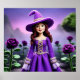Dieses skurrile Plakat zeigt ein Mädchen, das als lila Hexe verkleidet ist, stehend zwischen lebendigen lila Rose, und verbindet Fantasiecharme mit mystischen, bezaubernden Lebensformen. Fertig als Mixed Media Art Print.