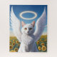 Ein weißer persischer Engel liegt auf einem Feld von Sonnenblumen.