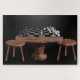 Puzzle avec tableau d'échecs, table et tabouret.