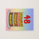 Ce dessin de puzzle à thème d'anniversaire charmant et joyeux présente une représentation de dessin animé d'un gâteau d'anniversaire à trois étages avec des bougies en forme de chiffres sur le dessus indiquant le numéro "48", ainsi que le message "HAPPY 48TH BIRTHDAY", et un nom de destinataire personnalisable. L'arrière - plan dispose d'un motif multicolore pastel en arc-en-ciel inspiré du spectre dégradé. Un puzzle d'anniversaire coloré et modifiable comme celui-ci pourrait être une façon amusante de délivrer des voeux d'anniversaire à quelqu'un qui célèbre son quarante-huitième anniversaire. [~Z0000621]