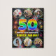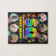 Ce design de puzzle d'anniversaire passionnant et joyeux comporte un grand nombre de "50" avec un spectre coloré d'arc-en-ciel inspiré motif dégradé, avec le message "HAPPY 50th BIRTHDAY," et un nom modifiable, sur un motif inspiré par des feux d'artifice multicolores. On peut customiser les images qui se trouvent en haut et en bas, peut-être avec des photos du destinataire, de sa famille et de ses amis. Un puzzle d’anniversaire joyeux et modifiable comme celui-ci pourrait être utilisé pour célébrer le cinquantième anniversaire de quelqu’un. (Photographie © Storytree Studios, Stanford, CA.) [~Z0000664]