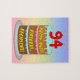 cette conception de puzzle d'anniversaire coloré et amusant présente une représentation de dessin animé d'un gâteau d'anniversaire à trois niveaux avec des bougies en forme de chiffre sur le dessus montrant le numéro "94", avec le message "HAPPY 94TH BIRTHDAY," et un nom de destinataire personnalisé. L'arrière - plan dispose d'un motif multicolore pastel en arc-en-ciel inspiré du spectre dégradé. Un puzzle d’anniversaire optimiste et modifiable comme celui-ci pourrait être utilisé pour célébrer le quatre-vingt-quatorzième anniversaire de quelqu’un. [~Z0000621]