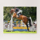 Un design photographique d'un cheval et d'un cavalier dans un concours de saut en spectacle.