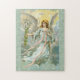 Peinture vintage en pastels avec un ange en robe bleu clair et tenant des fleurs.