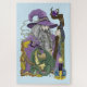 Un sorcier tout en violet tenant un bâton qui a une boule de cristal violet. Un petit dragon vert, un noeud celtique, une bougie et une bordure d'automne feuilles le tout dans un décor bleu clair