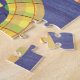 Un oiseau de dinde coloré et une visite conviviale d'épouvantail en automne. Des feuilles de citron jaune et de sienne brûlée encadrent la scène.
