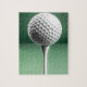 Une balle de golf blanche sur un tee blanc devant un arrière - plan vert.