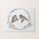 L'oeuvre d'origine de cette impression est une aquarelle et un crayon coloré d'un adorable couple de bleuets orientaux entouré d'une couronne fleurie. Oeuvre de l'artiste Jennifer Steffen, Emporium de Jenn.