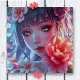 Un puzzle. Une belle fille aux yeux roses, fleurs et notes musicales de l'art glitchcore. Acents floraux violets et roses.