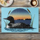 Un huard sur un lac au coucher du soleil et des cailloux sur fond de bleu