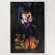 Sorcière blonde assise sur un grand citrouille orange. A ses côtés se trouve un chat noir sur une pile de livres. Derrière se trouve une forêt et un château