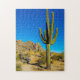 La photographie comporte un grand cactus multi-armé de saguaro par un sentier de randonnée qui mène vers une montagne répandue par rocher dans le désert de Sonoran.