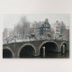 Photo puzzle puzzle avec un canal avec un pont, maisons traditionnelles et vélos sous un peu de neige en hiver dans la capitale hollandaise, Amsterdam dans la Pays-Bas.