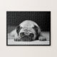 Photographie en noir et blanc d'un très adorable petit carlin aux yeux bruns âmes.