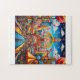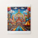 scène animée et colorée du parc d'attractions. Au centre, il y a une grande roue Ferris avec le mot "SKYLANE". Autour de la grande roue, il y a diverses structures lunaires, y compris des tours et des tentes avec drapeaux. Le ciel est rempli de montgolfières et de nuages moelleux. Sur les allées, on découvre une foule de visiteurs qui profite de l'ambiance festive. L'ambiance générale est celle d'une animation et d'un amusement, typique d'un parc d'expositions ou d'un parc d'attractions.