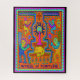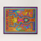 CARTE TAROT - ROUE DE FORTUNE - Des motifs géométriques et des figures abstraites aux couleurs vives entourent un motif central qui ressemble à une roue avec un design rayonnant. Au-dessous de la roue, une rangée de ce qui semble être des récipients ou des conteneurs est représentée, tandis que le titre "ROUE de FORTUNE" est affiché en haut en bas en caractères gras.