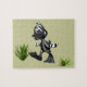 Un mignon dessin animé en noir et blanc rayé zèbre canard de dessin animé court joyeusement à travers l'herbe.