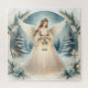 A serene celestial angel stands beneath a snowy archway of evergreens and winter florals, gently cradling a glowing lantern that spills soft golden light across her gown. Behind her, a dusky blue forest of snow-covered trees shimmers with falling flakes and tiny sparks of light, creating a peaceful, storybook atmosphere. Delicate lace details, flowing sleeves, and a halo-like crown of foliage give this winter angel illustration an ethereal, cottagecore charm that feels both nostalgic and on-trend. Soft blue and warm cream tones blend into a dreamy palette that suits spiritual holiday imagery, quiet reflection, and year-round messages of hope. This design is ideal anywhere a touch of calm, light, and heavenly beauty is desired. AI generated artwork.