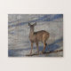 Un cerf femelle debout dans la neige près d'un ruisseau pendant une journée d'hiver froide à New York.