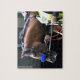 La Chambre de Bourbon, un puits a construit le colt musculaire de baie, portant un petit pain d'ombre de bleu royal. Cette beauté est tenue étroitement par son marcheur chaud pendant qu'il défile le pré chez Belmont Park. La photo de ce cheval de course avec la longue crinière noire, a été prise pendant l'été de 2016.