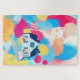 Cette illustration numérique représente un magnifique jardin magique en fleurs au printemps. Un grand chat blanc marchant parmi les arbres. Il y a une petite maison aux fleurs colorées et un petit chat noir sur le toit.