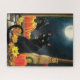 Un chat noir est assis dans une porte avec des citrouilles, une lanterne, un balai, des feuilles d'automne et une pleine lune de récolte derrière.