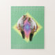 Calico cat regardant son image en miroir, debout devant une forme de diamant aux couleurs pastel arc-en-ciel. Le chat est long poil, principalement blanc avec des marron, et à motif noir fourrure. La race est un "Maine Coon"