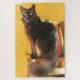 Chat noir assis sur la table avec des boules de fil. Cheveux longs, yeux dorés-verts. La lumière met en valeur la fourrure du chat et les bobines de fil.